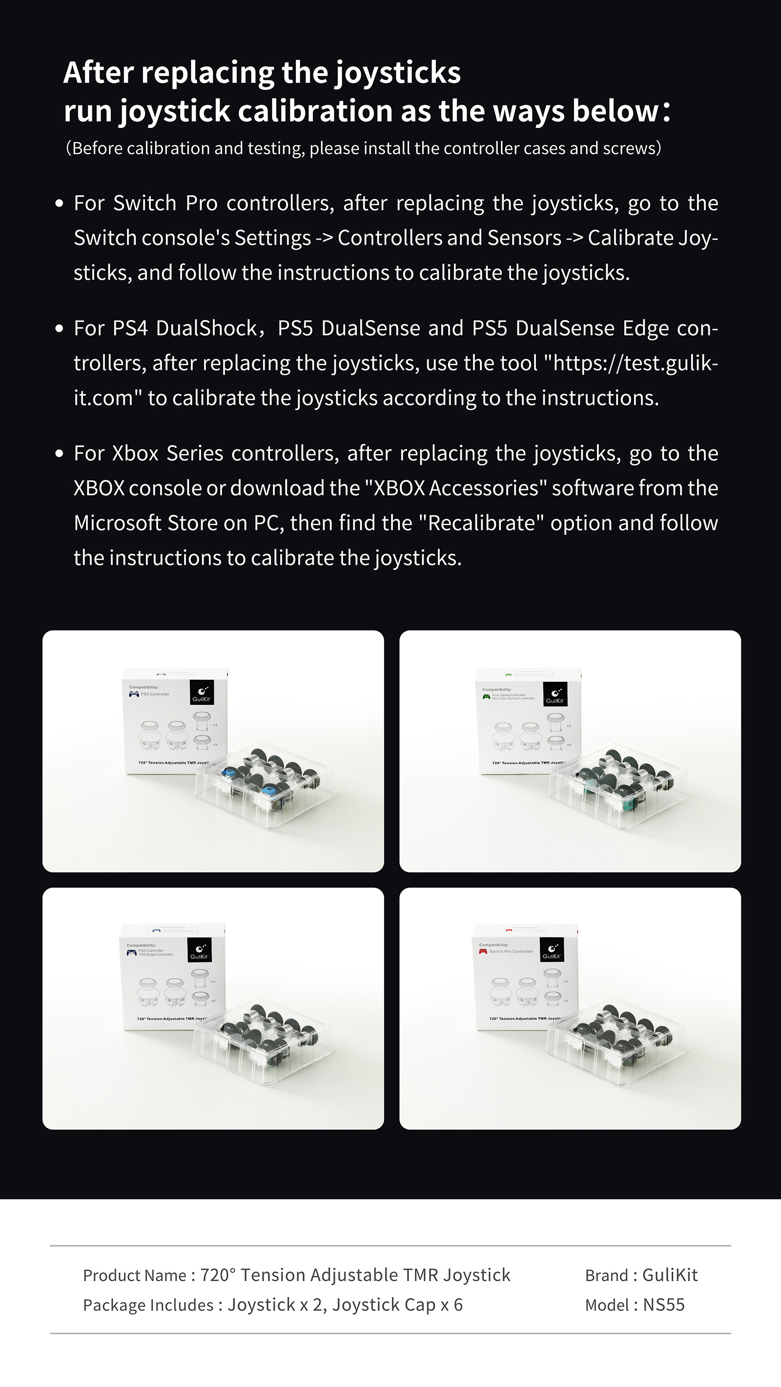 For PS4 DualShock , PS5 DualSense ,PS5 DualSense Edge and Switch Pro controllers, after replacing the joysticks, you can use the third-party open-source calibration tool at test.gulikit.com to calibrate the joysticks.