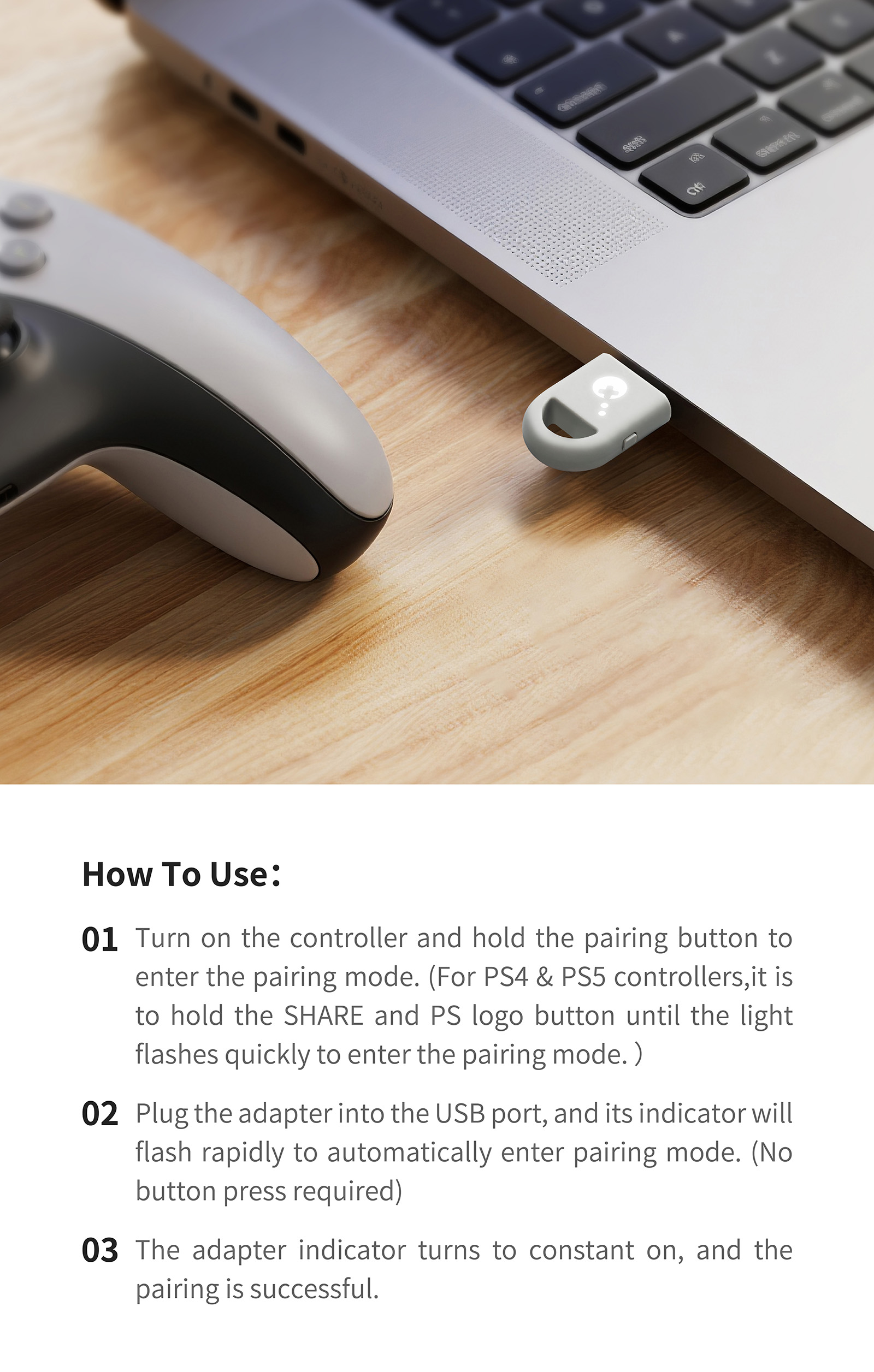 1. Turn on the controller and hold the pairing button to enter the pairing mode. (For PS4 & PS5 controllers,it is to hold the SHARE and PS logo button until the light flashes quickly to enter the pairing mode. )