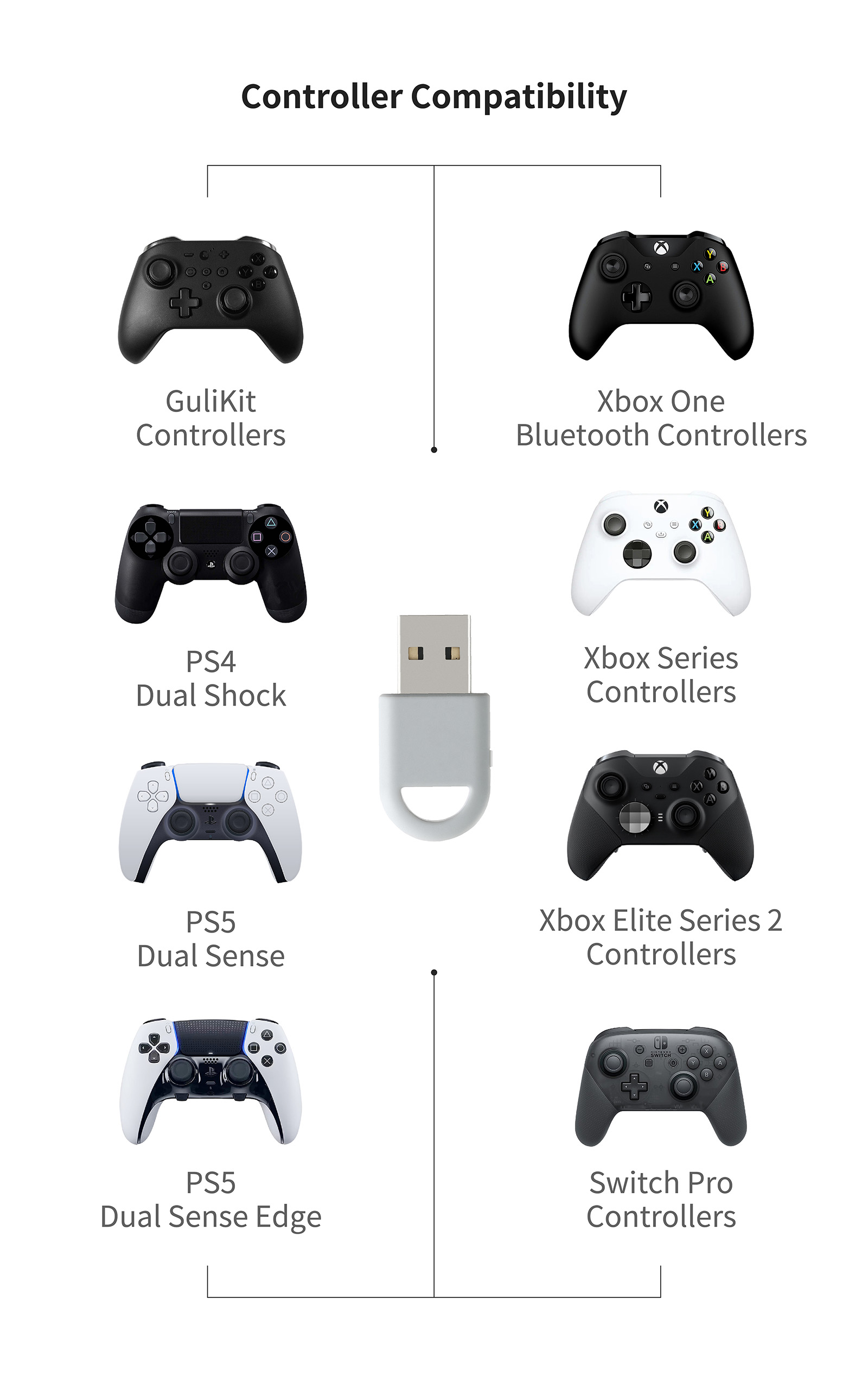 GuliKit controllers, Xbox One Bluetooth, Xbox Series, Xbox Elite Series 2, PS4 Dual Shock, PS5 Dual Sense,PS5 Dual Sense Edge, Switch Pro controllers.